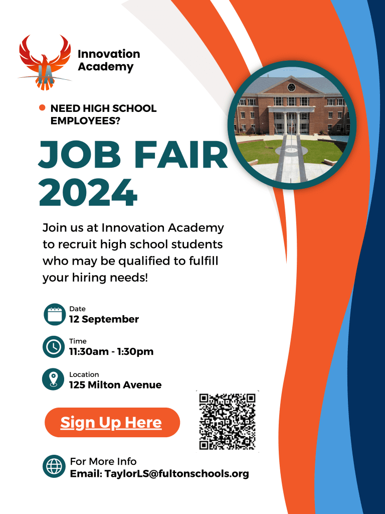 Are you an industry professional or local employer? Join us at Innovation Academy on Sept. 12th from 11:30-1:30pm to recruit high school students who may be qualified to fulfill your hiring needs! If interested, please contact Laura Taylor for more information.