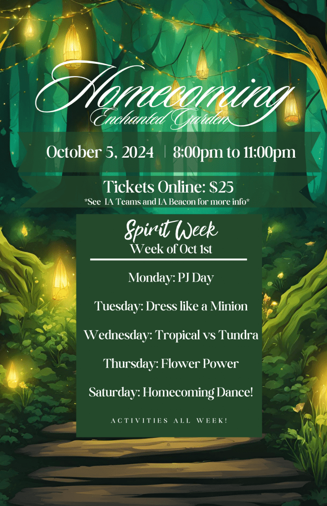 IA’s Homecoming Dance will be held on Oct. 5th from 8:00pm to 11:00pm. See below for info about purchasing tickets, bringing outside guests, and spirit week themes!