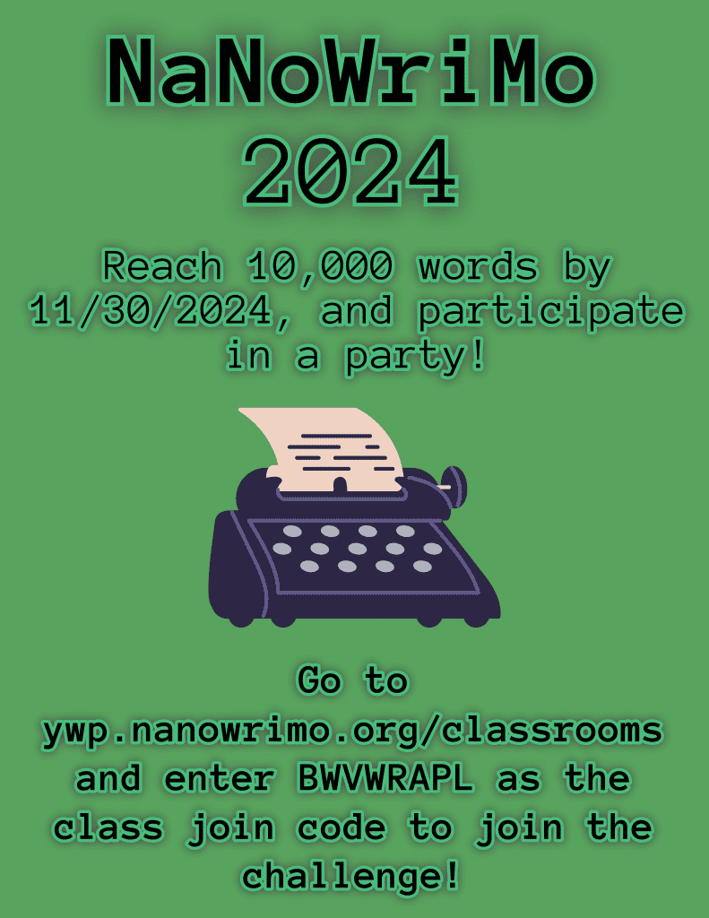 In honor of National Novel Writing Month, the STEAM Engine Club in partnership with the eXchange is hosting a novel writing campaign. Students can sign up by going to ywp.nanowrimo.org/classrooms and enter the code BWVWRAPL. Any student who completes at least 10,000 words can attend the celebratory party at the end of the month.