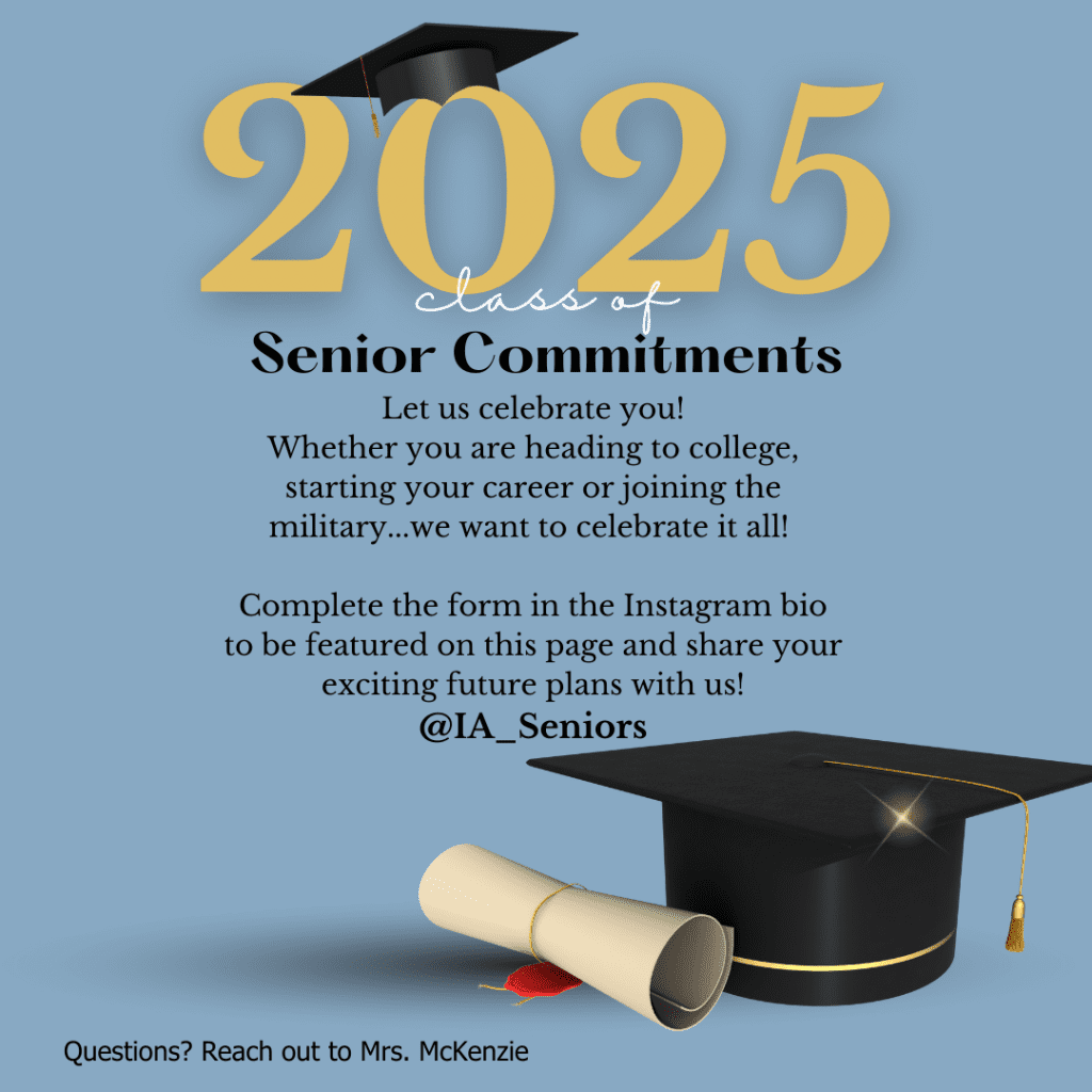 Class of 2025, let us celebrate you. Please follow, like and share our IA_Seniors Instagram page to see all of the wonderful places our Class of 2025 will go! Please see Ms. McKenzie for more info!