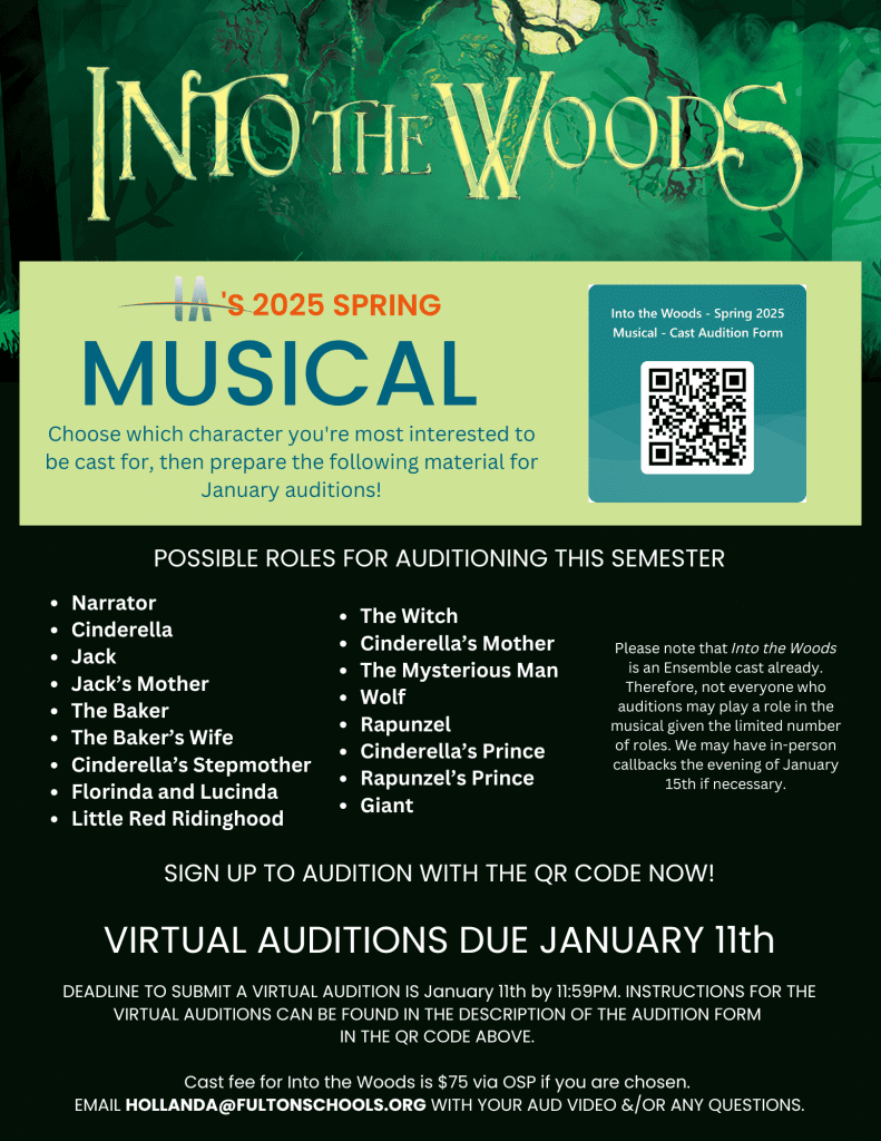 If you’re interested in auditioning for Into the Woods, complete this Microsoft Form and follow the Google Drive link in the Form description to find the necessary instructions for submitting a virtual audition for the show. Virtual Auditions are due January 11th by 11:59pm to my email at hollanda@fultonschools.org. If necessary, callbacks will be held after school on Wednesday, January 15th, so save the date just in case. Best of luck!