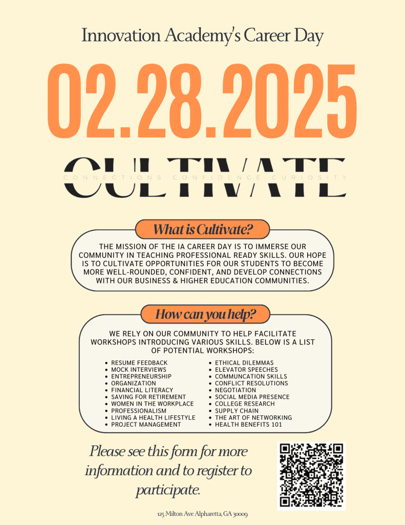 We would be delighted to invite you to participate in Innovation Academy’s 4th Annual Cultivate, our Professional Ready Skills Event! At IA, we are committed to providing authentic learning experiences for our students. Every opportunity they have to engage with business professionals offers them a valuable glimpse into the real world, enriching their education and broadening their perspectives. We invite to host 50-minute workshops throughout the day on any soft/hard skill you think is important for young students to be exposed to as they are preparing for their future.