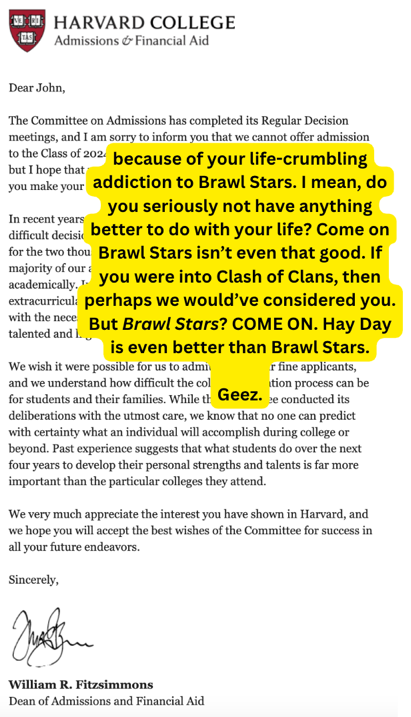 After a very thorough investigation where I talked to many people who were rejected from the schools they applied early to, I realized that all the people had a horrifying addiction to Brawl Stars. Yep. As I was asking them and consoling them about their rejection, their fingers were jamming away at their phone screens playing Brawl Stars. HOW IRONIC. As far as I’m concerned, the correlation between Brawl Stars and a college rejection is 100%. (The ones that got deferred were only addicted to Block Blast). Igotdeferredbecauseanaccidenthappenedwithmyapplication,notbecauseIhaveanaddictiontoasillygame.TheonlyaddictionIhaveistonotdrinkingwaterasmuchasIshould).