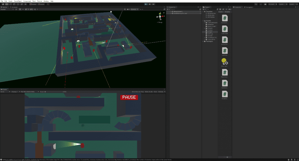 After this, students were let loose, provided with the requirement that they pick at least two customizations from a list of many possible ones, such as a jumping mechanic, secret collectable items, some way of showing the player the enemies’ range of sight, or lighting and imported asset packs to give the mazes a different mood. Players were also assigned to create various other screens for the title screen, as well as winning, losing, and pausing functions. This part of the project was due February 6th.