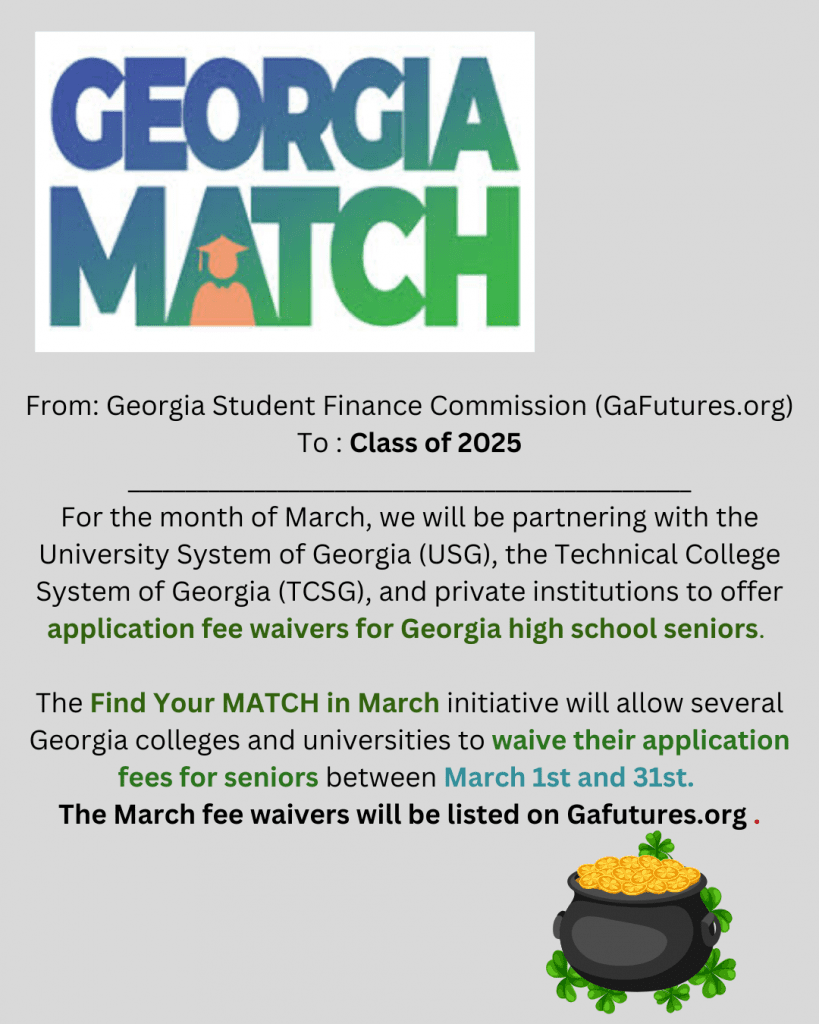 This initiative will allow several Georgia colleges and universities to waive their application fees for seniors between March1st and March 31st! All fee waivers are listed on Gafutures.org!