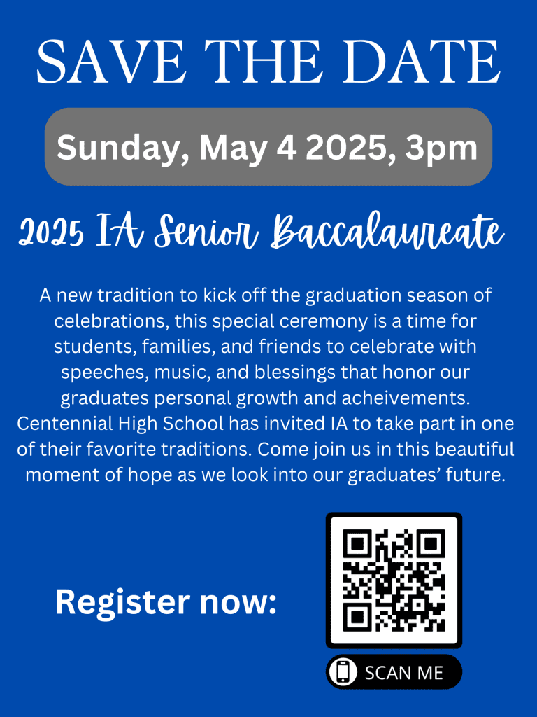 Come celebrate our graduates and send them off with love and encouragement at the 2025 IA Senior Baccalaureate Service on Sunday, May 4, 2025, at 3pm at Mount Pisgah Church, Johns Creek, GA.
