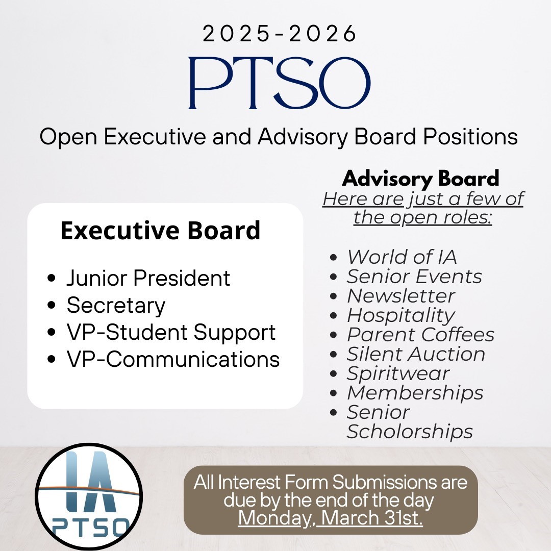 All slated candidates will be posted electronically on our website home page at http://www.iaptso.org no later than Wednesday, April 27th for at least ten days prior to vote by our general membership at our fiscal year Q4 meeting on Wednesday, May 7th at 7 pm on in accordance with the IA PTSO Bylaws. If you would like to talk to a current member of the executive board to ask questions please email info@iaptso.org and they will be happy to reach out!
