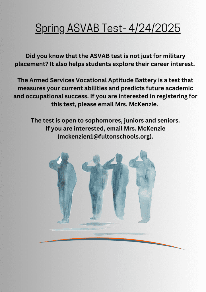 Are you interested in exploring different career interest and/or a career in the military? Sign up for the ASVAB test, held on 4.24.25