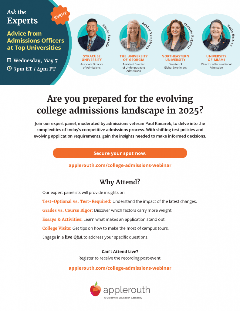 Ask the Experts: Advice from College Admissions Directors Panelists from UGA, Syracuse University, Northeastern University, and University of Miami. This virtual panel will be held on Wednesday, May 7th @ 7pm EST. Register here if you’re interested and be sure to see below for more information!