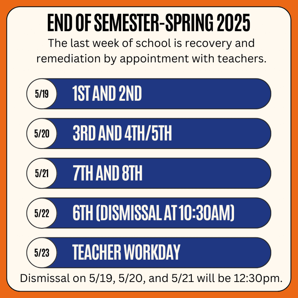 In the case that some assistance is needed to finalize the semester, the final week of school is recovery and remediation by appointment with teachers, see below for schedule. 5/19, 5/20, 5/21 will dismiss at 12:30pm and 5/22 will dismiss at 10:30am.