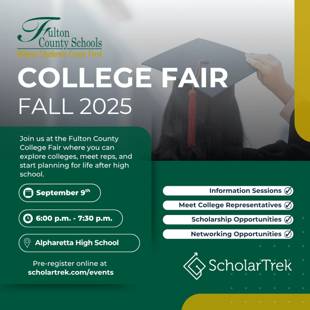 Register to attend the Fulton County College Fair on September 9th at Alpharetta High School. This college fair is open to all grades.