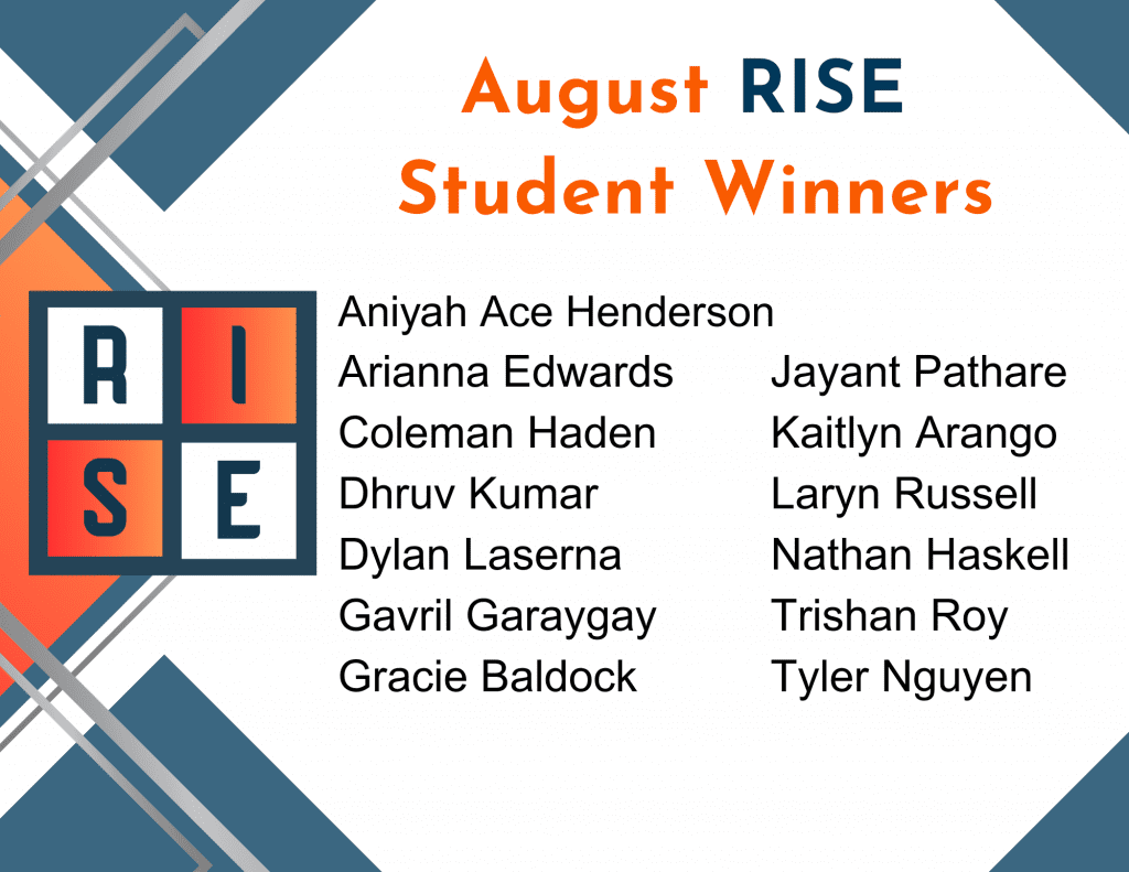 Below are our August RISE winners. They were nominated by Staff or Students for demonstrating on of the 4 pillars of espect, Integrity, Self-Motivation, or Empathy. Great job contributing to our positive school culture at IA!
