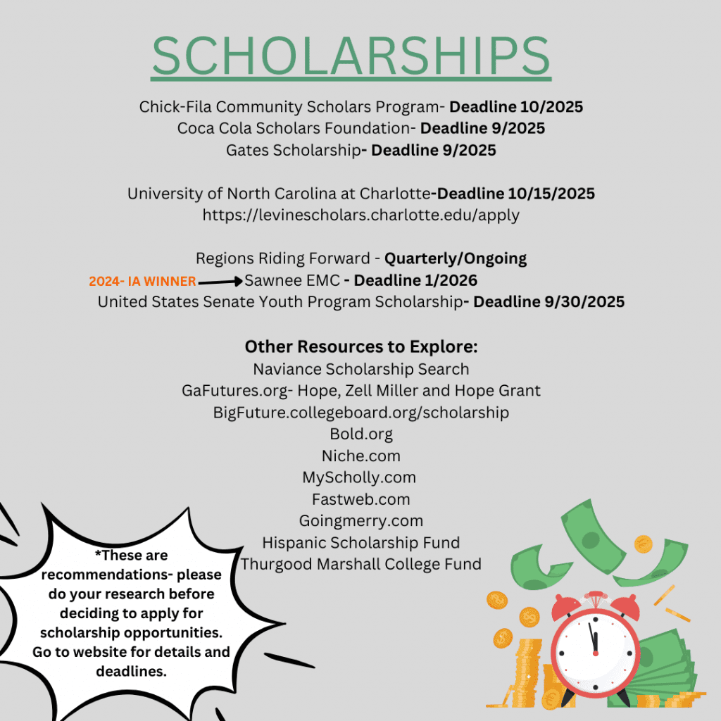 Check out these amazing scholarship opportunities! These are recommendations, please go to the website for details and deadlines. Stop by Flight School to see Mrs. McKenzie if you have any questions.