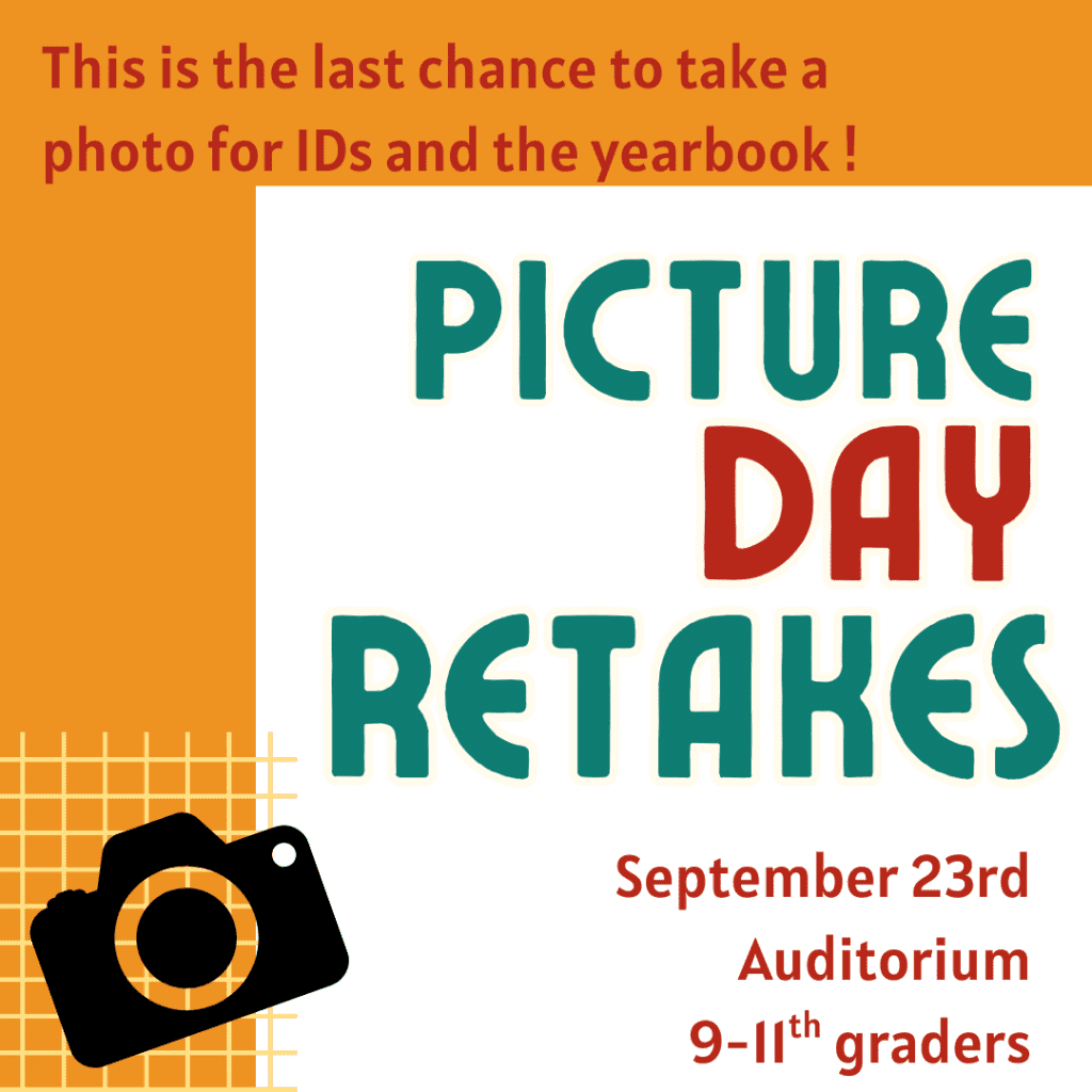 Picture retakes for 9th -11th graders will be held on Tuesday, Sept. 23rd all day in the Auditorium. Stop by to take your picture during your lunch or virtual period (if you are in good academic standing in your virtual class). This is for students who need to retake their original picture, as well as for students who missed picture day in August. These pictures will go in the yearbook, on your IDs, and in Infinite Campus.