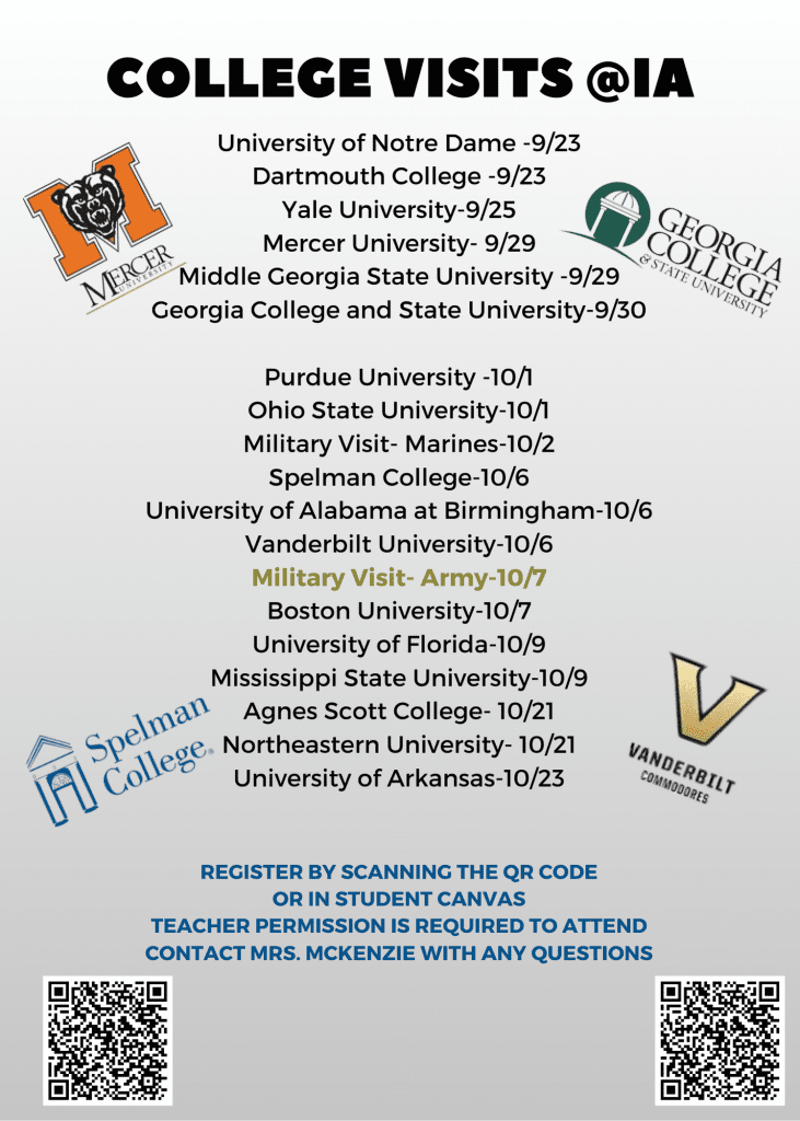 Check out the College Visits @IA. Our college visits are in full swing! Students, please sign up in Student Canvas. Teacher permission is required to attend.