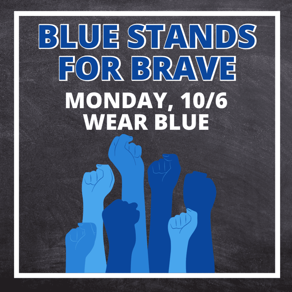 Blue Stands for Brave – wear blue to show you that you are brave enough to stand up to bullies. October is Bully Prevention Month and let’s show that IA students are brave enough to stand up to bullies by wearing blue!
