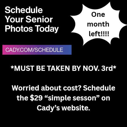 Last month for senior portraits! Please make sure you schedule AND take your senior portrait before Nov. 3rd!! No portraits taken after November 3rd will be accepted for the yearbook. Visit cady.com to schedule. Worried about cost? There is a $29 option (called the “simple session”). You only have to have a formal photo OR cap and gown for the yearbook. Questions? Come see Ms. Scenna in Rm 123.