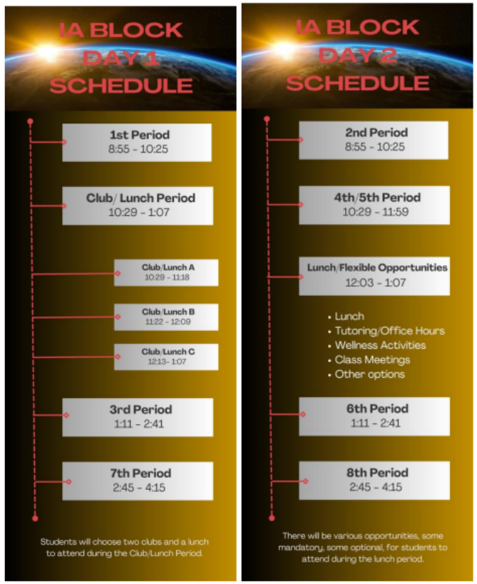 In the past, IA used a block day schedule where classes were split between two days and were 90 minutes long. Whereas, now we follow an altered club week schedule for the entire week where all normal classes are taken each day in addition to one 45-minute time period dedicated to club time.