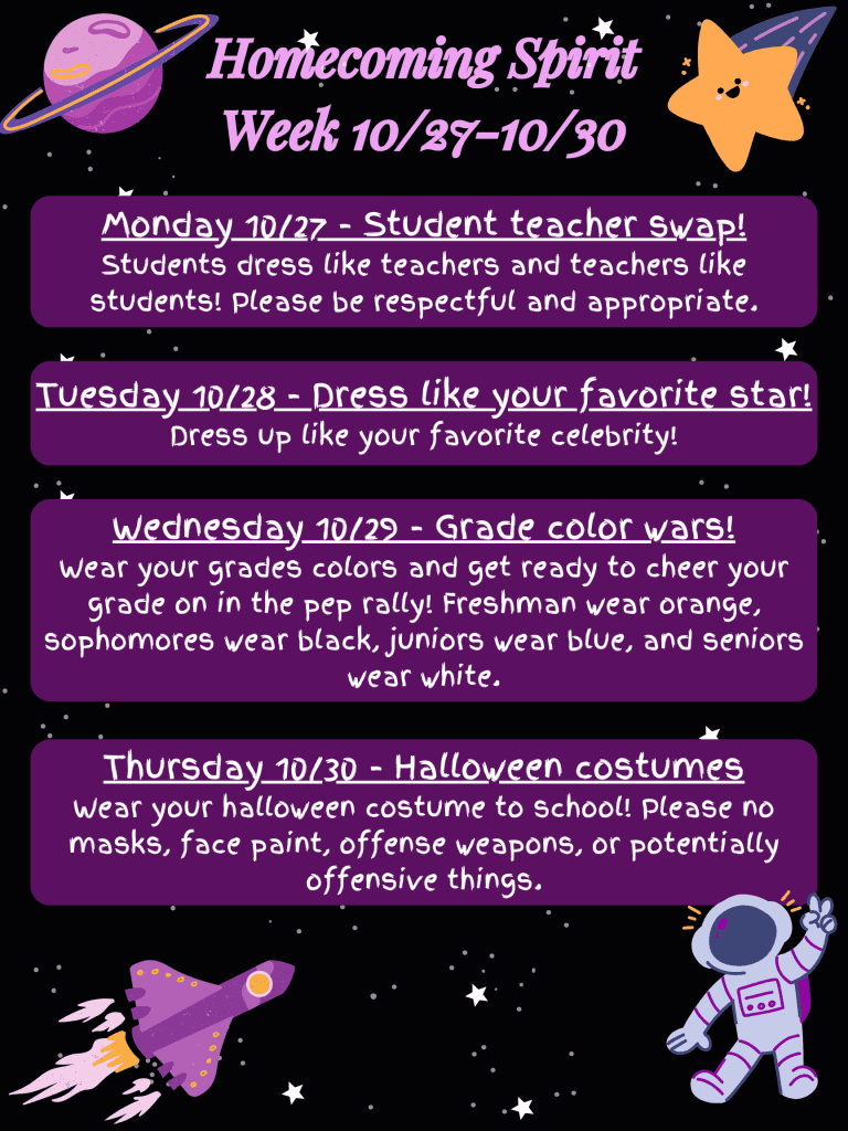After a week full of hallway competitions, spirit days, and pep-rally excitement, the celebration will all come together at the dance on Saturday, 11/01. The hangar will be transformed into a glittering night sky filled with lights, music, and memories waiting to happen. If you enjoyed last year’s dance, Ms. Turner shared that, “a special IA celebrity will be reprising his role as DJ for the second homecoming in a row,” adding more excitement to what will already be an unforgettable night under the stars!