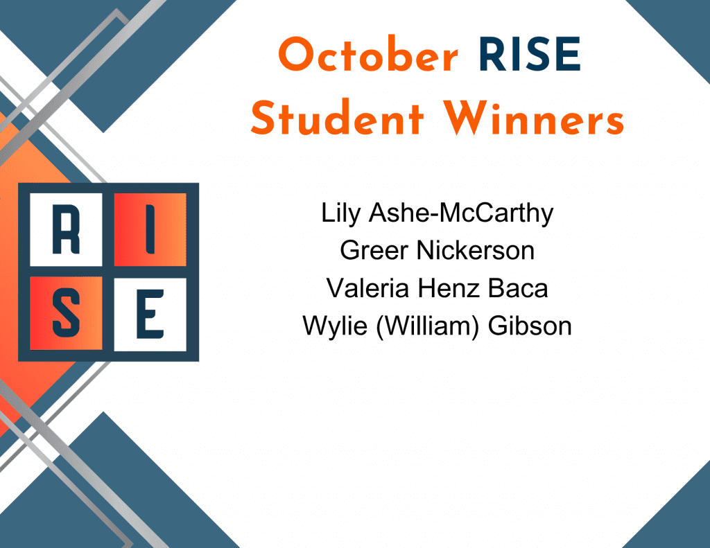 Below are our October RISE winners. They were nominated by Staff or Students for demonstrating on of the 4 pillars of Respect, Integrity, Self-Motivation, or Empathy. Great job contributing to our positive school culture at IA!