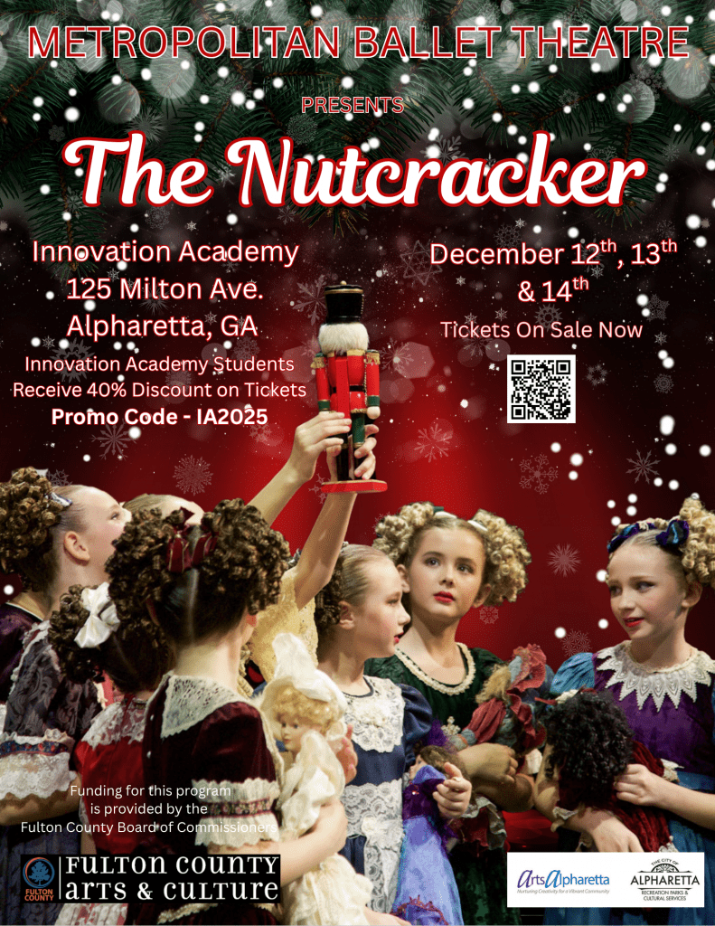 We are pleased to announce that there will be IA students and staff participating in this year’s presentation of The Nutcracker by the Metropolitan Ballet! Please come and enjoy a night out with your family and support our IA community! Scan or click below and use Code IA2025 for a discount on student tickets now!