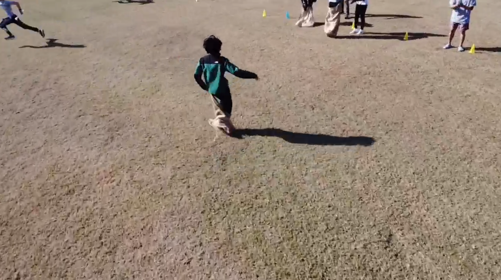 Like any traditional sack race, students go to one end of field in a potato sack and tags their friend who races back to start in a potato sack. Its harder than you think to race in a sack!