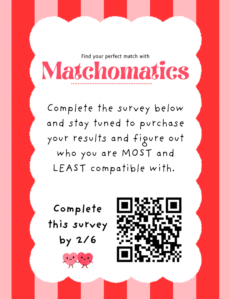 Matchomatics is officially back! Fill out the survey (https://www.surveymonkey.com/r/VRCVVC2) by Friday, February 6th to find out who you’re MOST and LEAST compatible with.