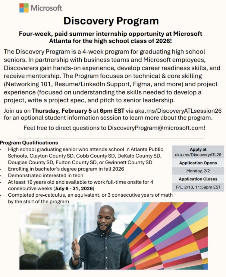 Class of 2026, applications are open for the Microsoft Discovery Program, a four‑week, paid summer internship designed for students interested in technology, career readiness, and hands‑on project experience. Deadline to apply 2/13. Apply at: