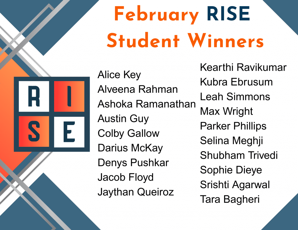 Below are our February RISE winners. They were nominated by Staff or Students for demonstrating on of the 4 pillars of Respect, Integrity, Self-Motivation, or Empathy. Great job contributing to our positive school culture at IA!