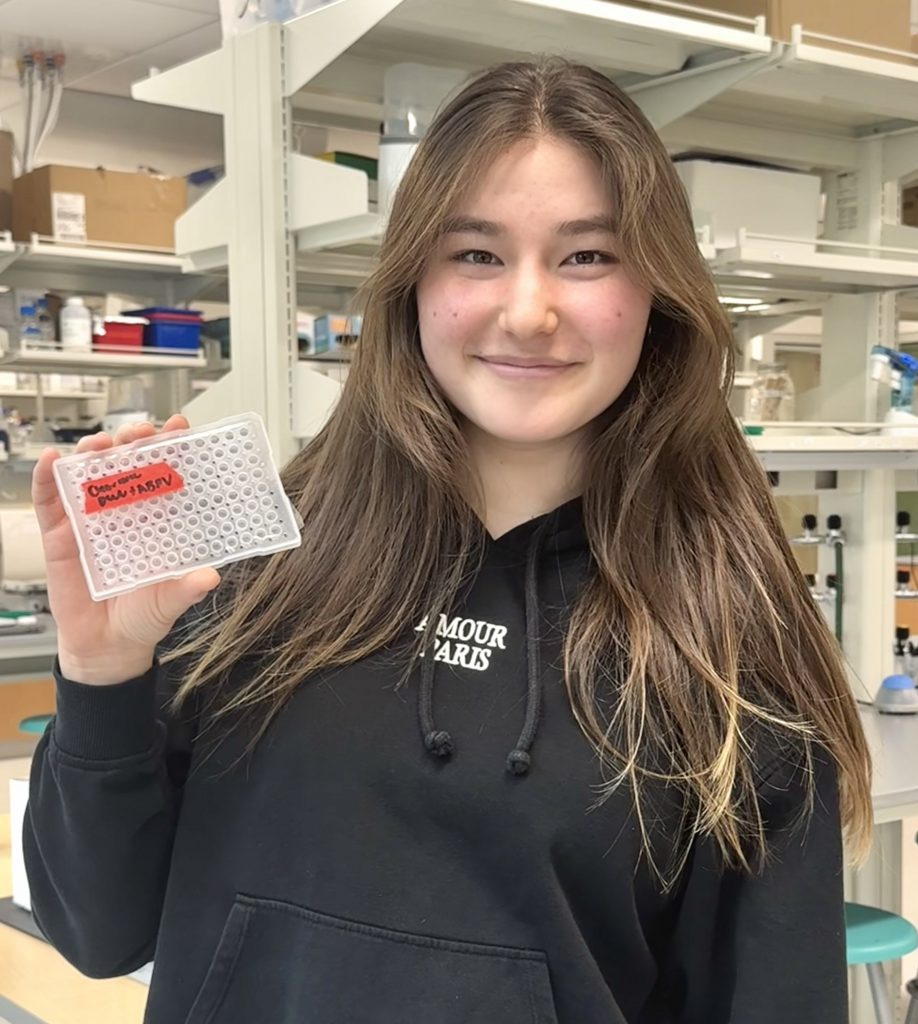 Senior Charlotte Chon, a student in Biotechnology Research, has been investigating viral diseases found in Varroa destructor, a parasitic mite that harms honeybees. She collected mites from hives in the IA apiary and extracted RNA from their tissues. Using a technique called rt‑qPCR, she tested for Deformed Wing Virus (DWV), a virus that can be deadly to honeybees.